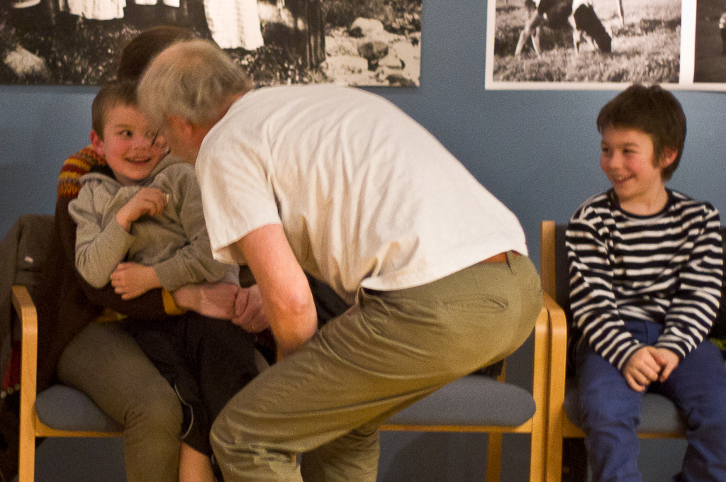 Per berättade en lokal sägen om vatten som både förenar och skiljer, om ynglingen som sam från Koltur till Hestur för att möta sin älskade vän. Eva berättade den hos oss okända ursprungshistorien om hur koljan fick sina svarta fläckar, och den hade nästan alla i publiken i detta land omgivet av vatten och fisk hört. Siv fortsatte med en dråplig helt sanningsenlig historia om när hon simmade klädsim och lånade systerns nyinköpta batikklänning från Bulgarien. Med kroppen som språk levandegjorde Mikael hur leoparden tappade en fläck. Och den historien hittade han efter lite letande bakom örat på en pigg och lurig pojke.