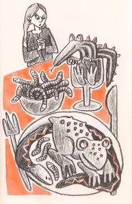 Det var en liten fisk som stack upp nosen och sjöng. Ursinnig tog han en stor sten, med all kraft slungade han den i vattnet så fisken krossades.