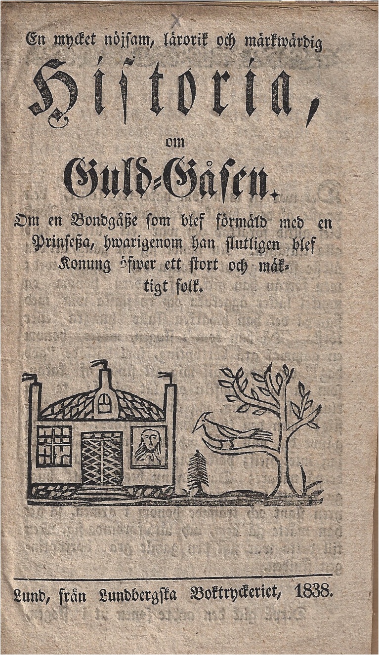Skillingtryckets första sida har ofta en naivt uttrycksfull bild. Jag ska publicera en del sådana här små bilder på bloggen. Det blir bilder från såväl Grimmsagor som andra samlingar. Bilden ovan illustrerar En mycket nöjsam, lärorik och märkwärdig historia om Guld-Gåsen. Sagan finns hos Bröderna Grimm.