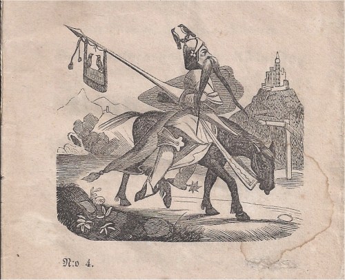 Bilden av den dråplige riddaren som sitter bakvänd på hästen, men med huvudet i ridriktningen, utgör omslag till den populära berättelsen om Riddar Finke.
