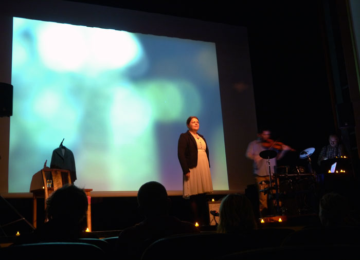 I kväll har jag sett Sally Pomme Claytons föreställning som hon skapat tillsammans med Panos Ghikas och Fotios Bergklis. En fascinerande föreställning där berättelser från många olika tidsplan smälter samman med ljud, musik, röster, fotografier och abstrakta bildrörelser. Det är en personlig livsberättelse där andeskådaren Emanuel Swedenborgs tankar och visioner bryter in i.