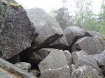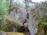 Hon för mig tillbaka till Kanaberg, som jag senast besökte i våras. Men jag känner mig inte alls trygg. Jag är inte rädd för trollen, men det finns ett annat hot i bilden. Mannen på bilden, som kan vara jag, verkar står stadigt på stenen, vänd ut mot skogen. Men är skogen en trygg tillflykt där vi kan plocka bär och svamp och uppleva ro? Eller händer det något förödande där ute, något som undergräver vår fortsatta existens? Och står jag i själva verket så stadigt på stenen? De stenar som en gång fösts ihop av naturens krafter, kan vi vara så säkra på att de kommer att ligga där i all evighet.