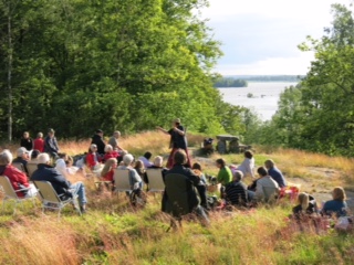 Jag ser en vätte med sin gråa luva, som sitter halvgömd bakom en sten. Vi blinkar åt varandra, det här ska bli kul, tycker vi båda. Några av åhörarna har sina hundar med. Plötsligt får en hund vittring på vätten, börjar skälla och sätter iväg bort mot stenen och husse efter!