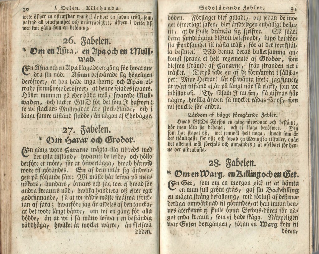 En utgivning av fabelsamlingar på svenska var en förutsättning för att fablerna skulle få större spridning. Den största svenskspråkiga samlingen av fabler under den undersökta perioden är Allehanda Sedolärande Fabler, som utkom 1767 och var en översättning från engelskan. Samlingen innehåller 491 fabler och ansluter till det lutherska fabelbruket.