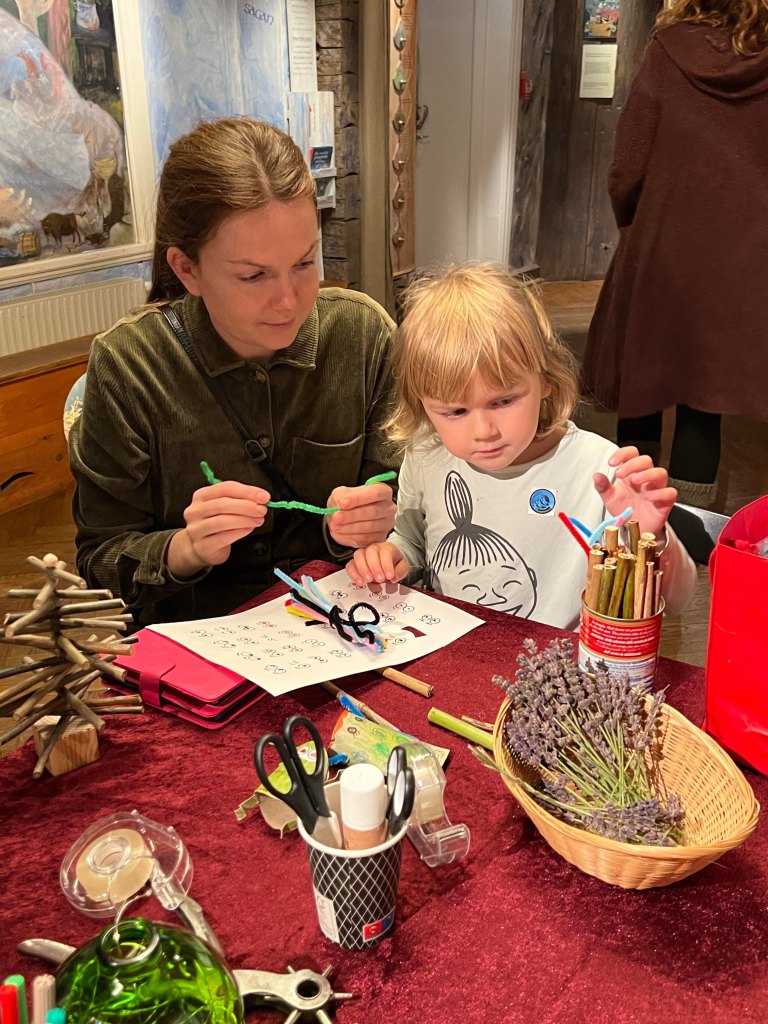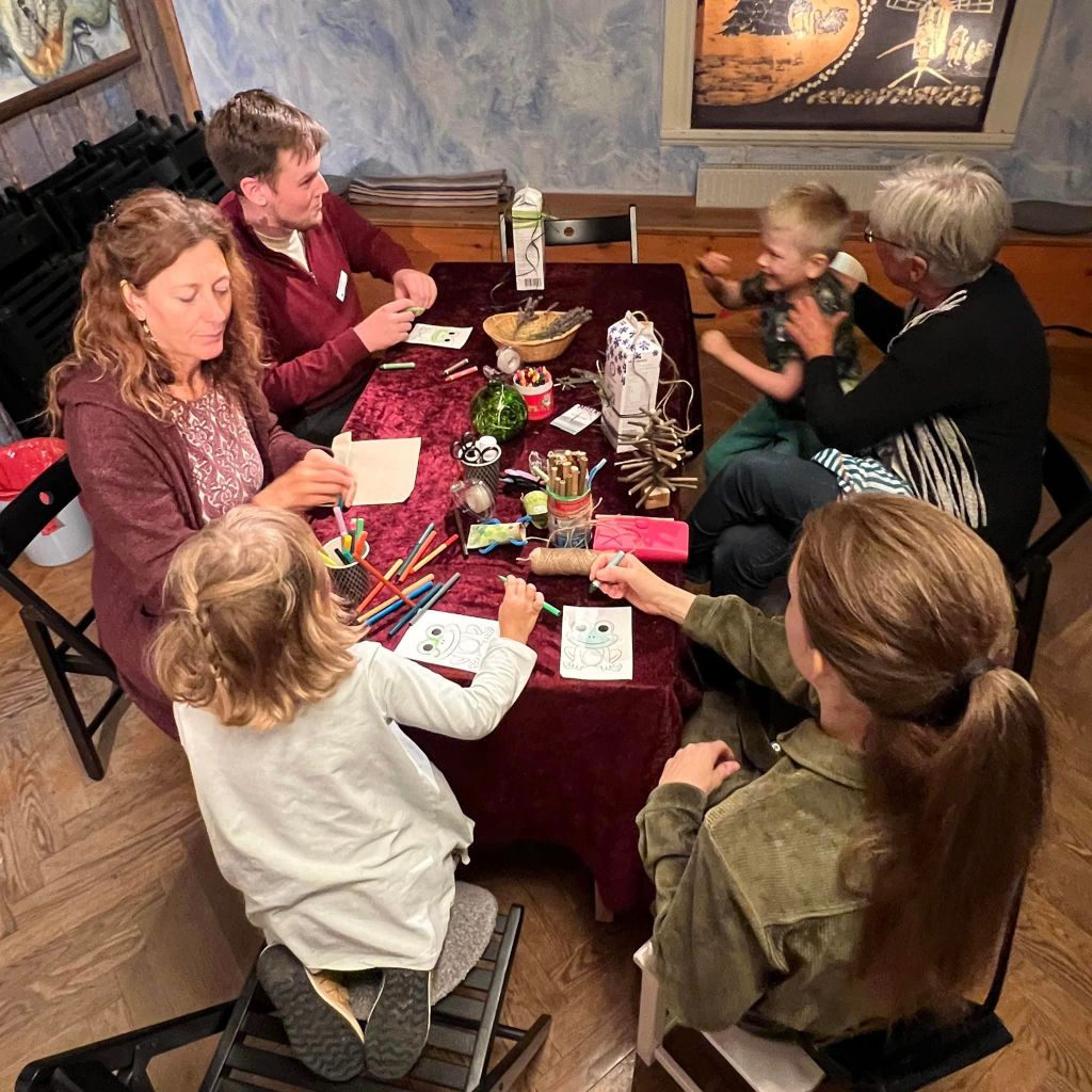 I Berättarrummet byggdes det insektshotell och hoppande grodor av bl.a. gamla mjölkpaket, toalettrullar, grankottar, bambustavar. Och när en minst anade dök det upp en berättare, som överraskade med historier kopplade till det som skapades på plats.