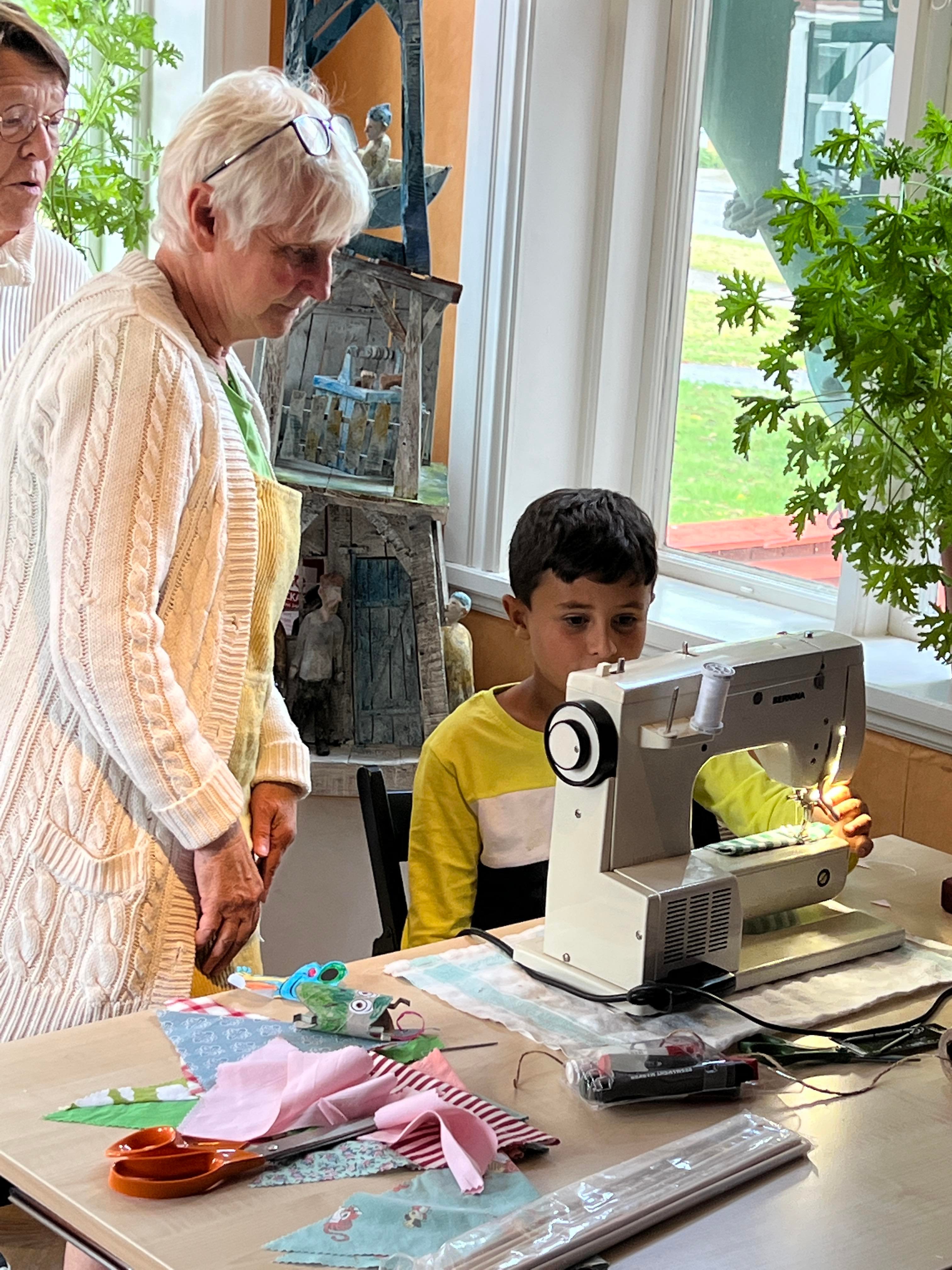 Museets grannar Hållbar Butik var på plats på verandan med symaskiner, strykbräden och tyger i allsköns färger och mönster. Här kunde man sy flaggor och vimplar, och ett barn utbrast: ”Jag är lite vimpelsugen!”