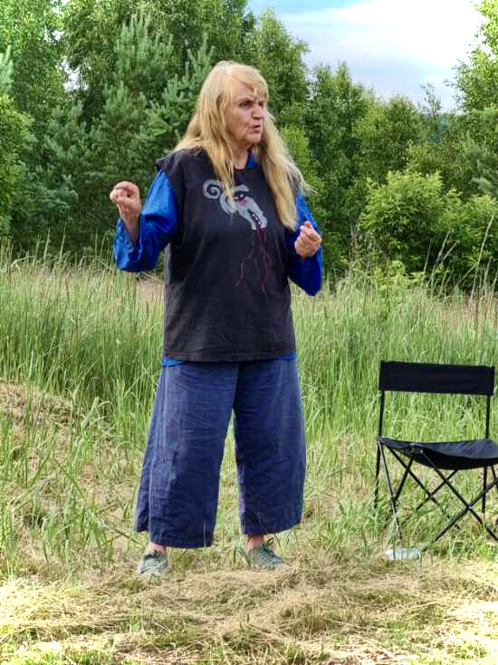 Jag hade läst någonstans (var?) att en enda natt om året kommer en galgbacke till liv. Bara för en natt och alltid i juli. Då vaknar alla som avrättats upp, vacklar omkring, en har inget huvud, en annan har snaran kvar om halsen, blå i ansiktet och tungan hänger ut….. Ljuden blev tydligare. Klampet av stövlar, rytande befallningar, svordomar. Klagoskrin, gråt och skrän. Jag tog min man i armen. – Hör du inte? Alla rösterna! Det här är en ond plats sa jag, jag vill hem.