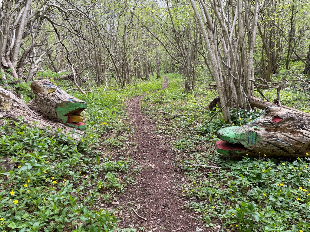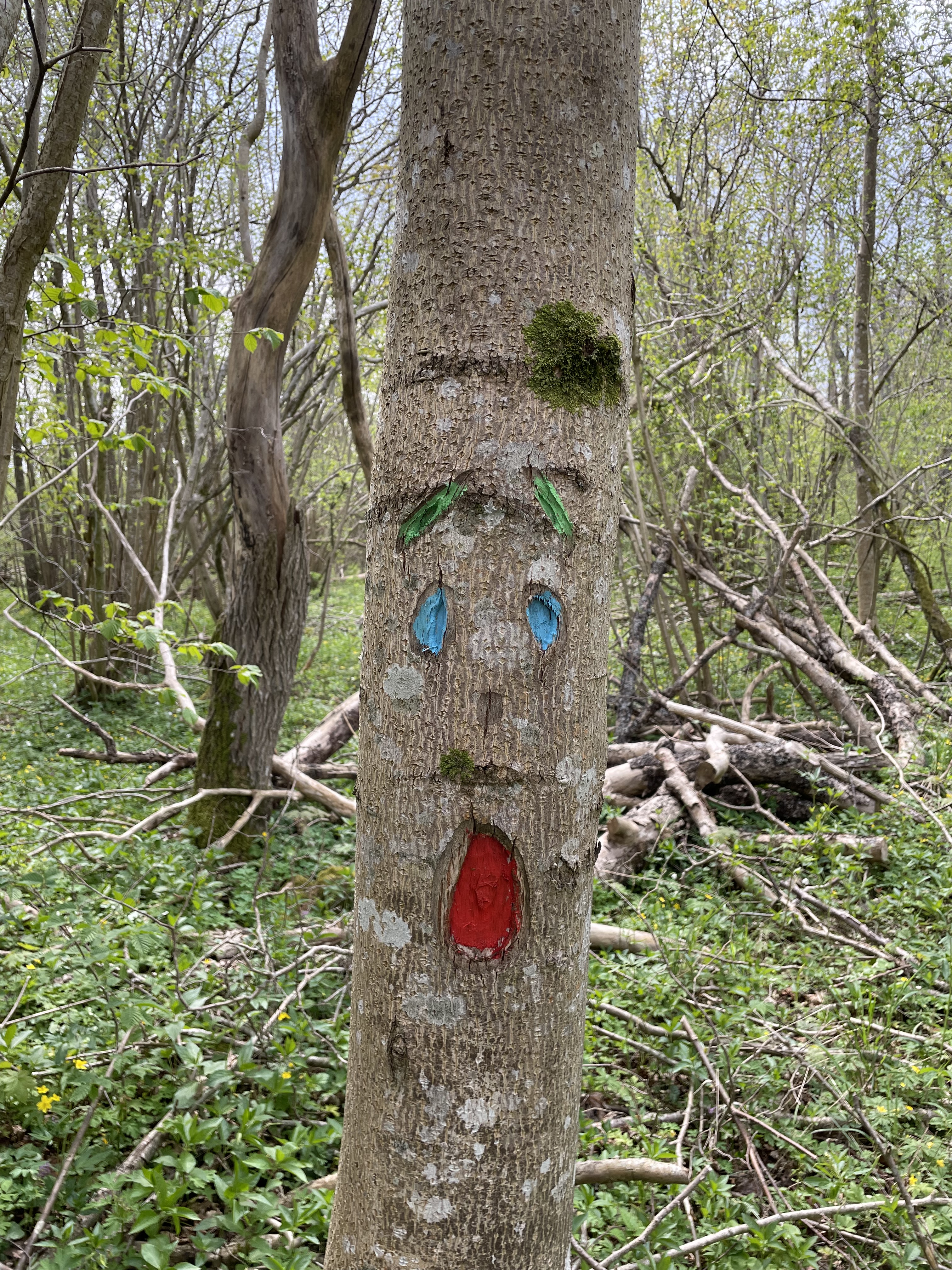 Jag har nog aldrig vandrat på en led där skyltningen är så genomtänkt. Jag lär mig massor. Och det blir inte sämre av att naturen är så omväxlande och vacker. När vi går blommar allt på en gång: blåsippor, vitsippor och gulsippor. Och leden blir inte sämre av en roande lekfullhet.