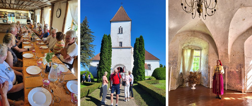 Varje kväll i Kuldiga fick vi middagsbuffé på vårt hotell. Kvällarna var vackra och vi kunde sitta i mindre grupper ute på altanen. Sista kvällen hade dock utlovats regn. Därför satt vi inne och de som ville delade med sig av sina reflektioner över vår resa. Det var idel lovord och vi kallade även in hotellets kockar för en särskild hyllning. Men det fanns förstås också en del funderingar över situationen i Lettland och världen i övrigt, och en förståelse för den stolthet över landet och Kurland, där vi befann oss, som våra guider gett uttryck för. Lettland är ju en ung nation.
