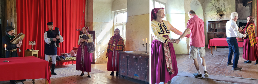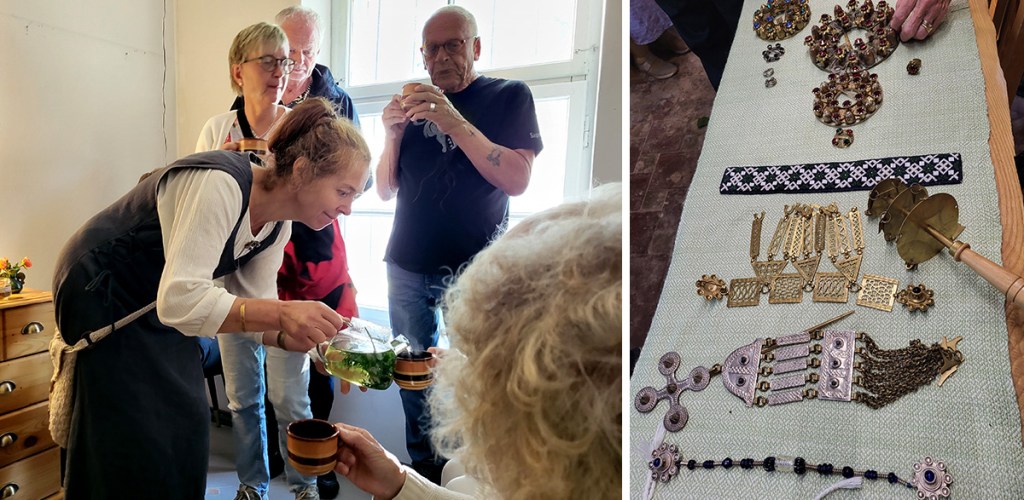 Sedan fick vi träffa Inas vän Eva som bjöd på ollonkaffe, örtteer och morotspaj i en liten lokal där hon även sålde lite hantverk. Ina förevisade traditionella textilier och smycken och vi sjöng lettiska folksånger tillsammans. När vi blev tillfrågade om en svensk sång, blev det ”Ju mer vi är tillsammans” med tillhörande rörelser. Passande, men kanske ingen folksång precis. En man kom med färska lövruskor och gav oss energi genom att vifta med dessa över våra kroppar. Lätt omtumlade tog vi sedan lunchrast.