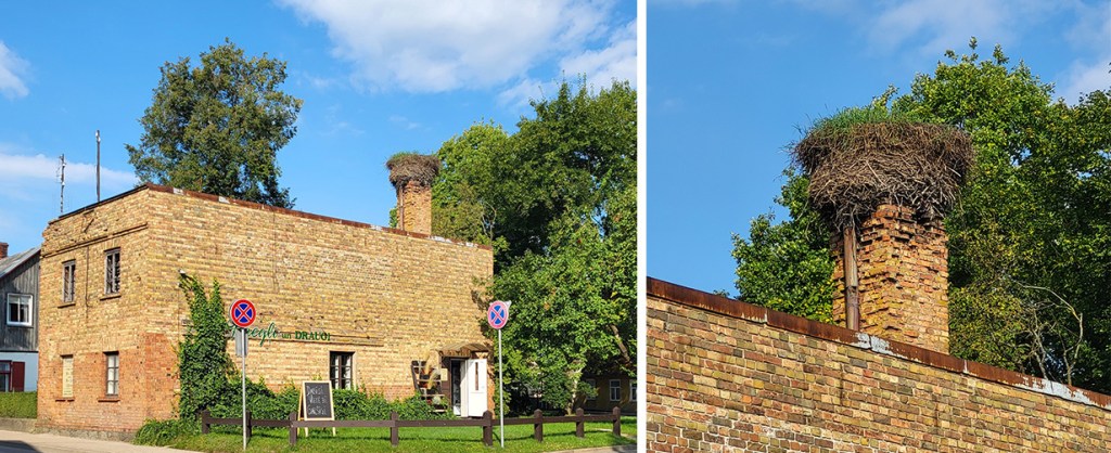 Från bussen såg vi många storkar under resan, dock inte i Kuldiga. Detta storkbo verkade obebott.