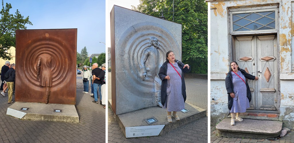 Morgonen den 4 september mötte oss med lika vackert väder som följt oss under resan hittills. Mötte oss gjorde även Ina Celitane, initiativtagare och ledare för berättarverksamheten i Kuldiga. Vi mötte henne vid en skulptur som visar steget från det gamla till det nya Kuldiga.