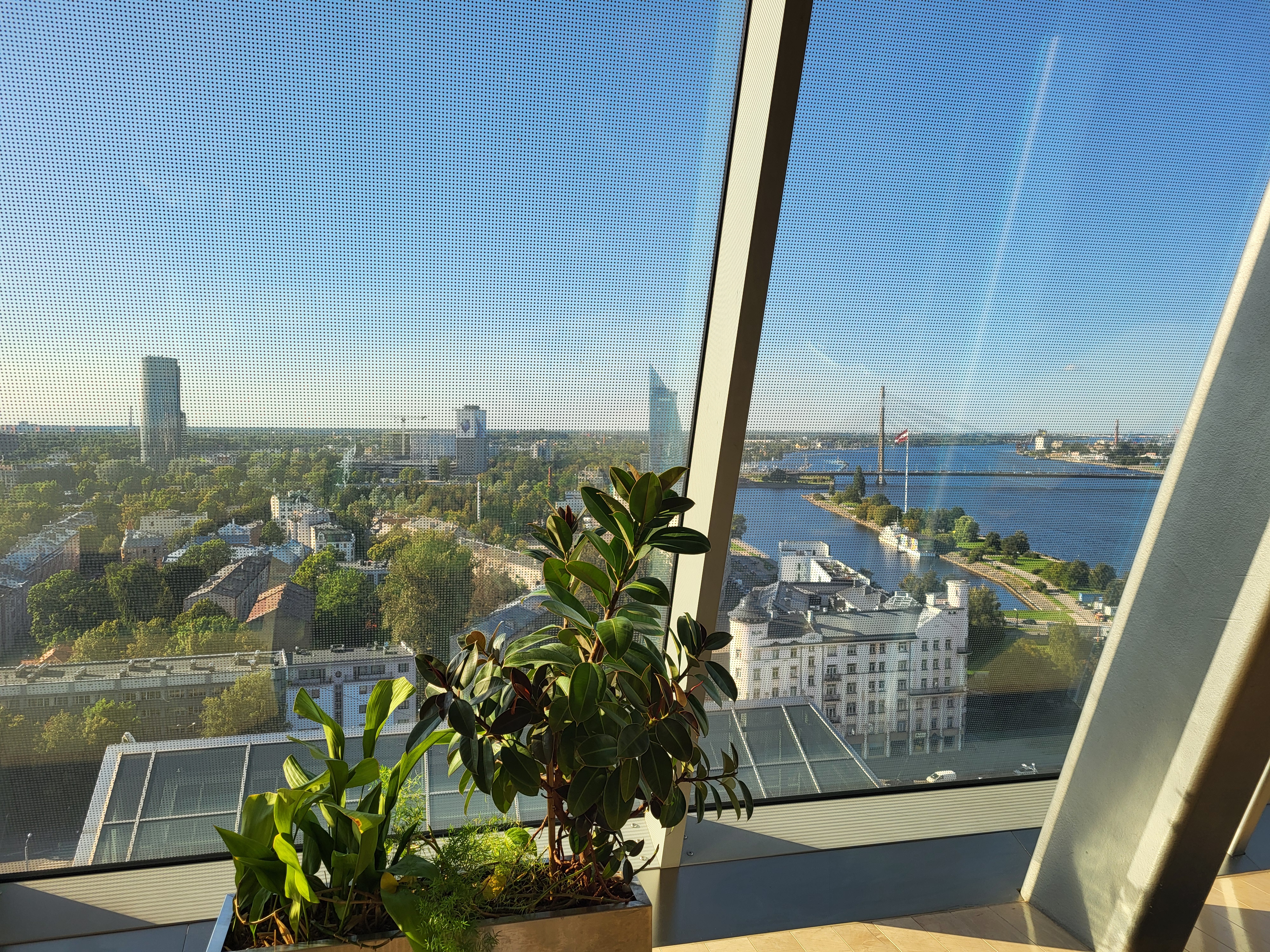 Utsikten över staden från bibliotekets översta våning var magnifik, även om glasväggarna var prickmönstrade för att förhindra att fåglar flög in i dem.