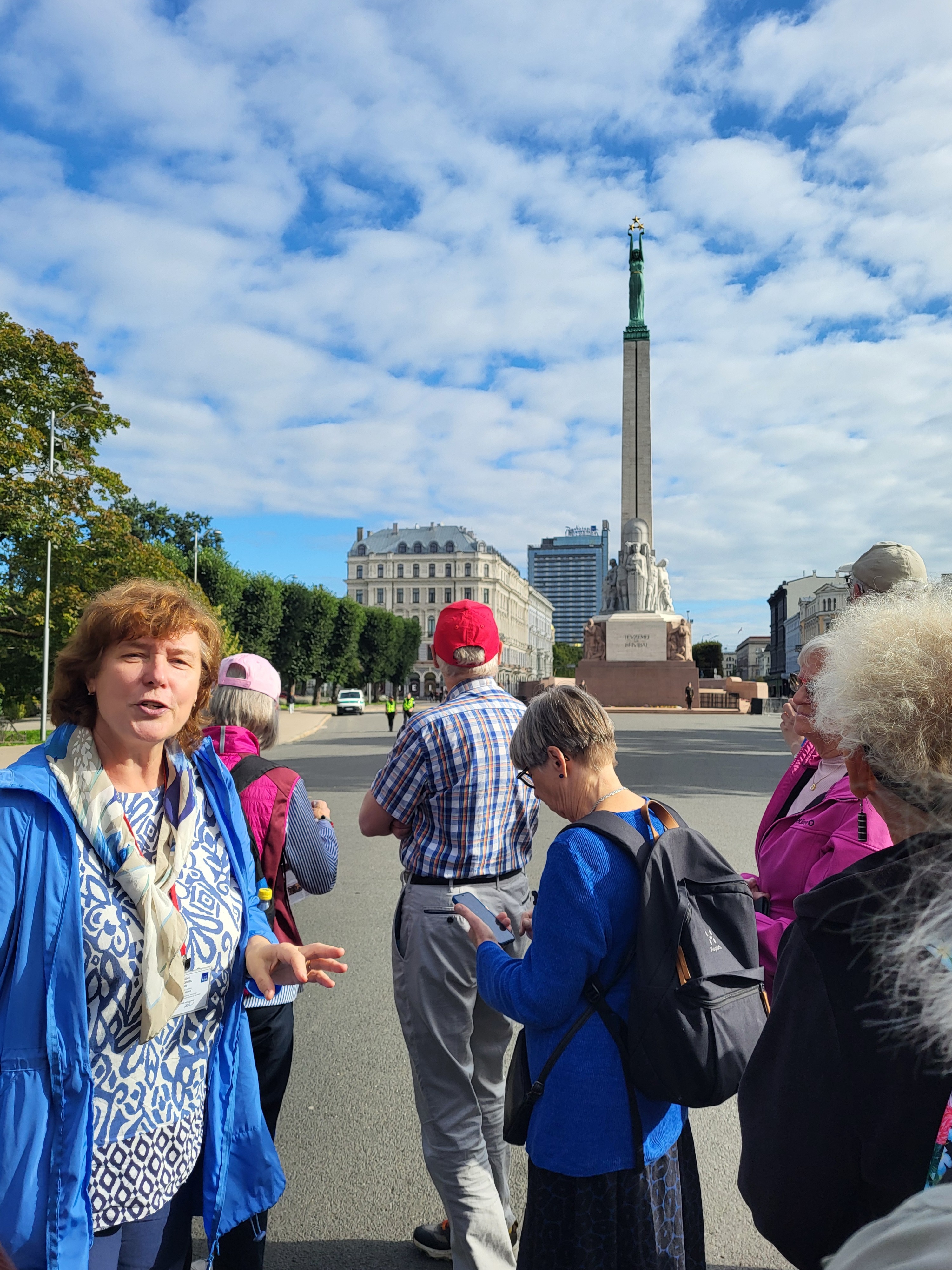 Dagen i Riga började med en sightseeing, först med buss, där Jörgen fick visa prov på sin formidabla körskicklighet. Det var små trånga gator och ganska mycket trafik. Vi fick se stadens olika byggnader, intressant arkitektur och minnesmärken. Det finns en stor stadsdel med vackra jugendhus som kontrasterade mot hus från Sovjet-tiden och nutida modernistiska skapelser. Vår guide berättade om stadens historia under bussturen och guidade oss vidare när Jörgen sedan släppte av oss vid Frihetsparken. Mitt i denna står Frihetsmonumentet, som anses vara en viktig symbol för Lettlands självständighet.
