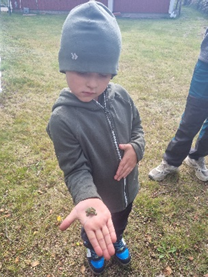 Därefter var det dags för geocaching! Vi värmde först upp med att besöka den geocache som sedan tidigare redan fanns på hembygdsgårdens område. De som inte hade testat på geocaching förut guidades genom processen. Klockan kvart över tolv var det dags för premiär av våra nya geocacher. En av dessa finns i närheten av hembygdsgården och det var förstås den vi valde att hitta tillsammans. Snabbast av alla med att hitta cacherundans första cache var dagens mest entusiastiske skattletare, Wille. En liten groda fick han med sig från sitt fynd.