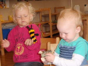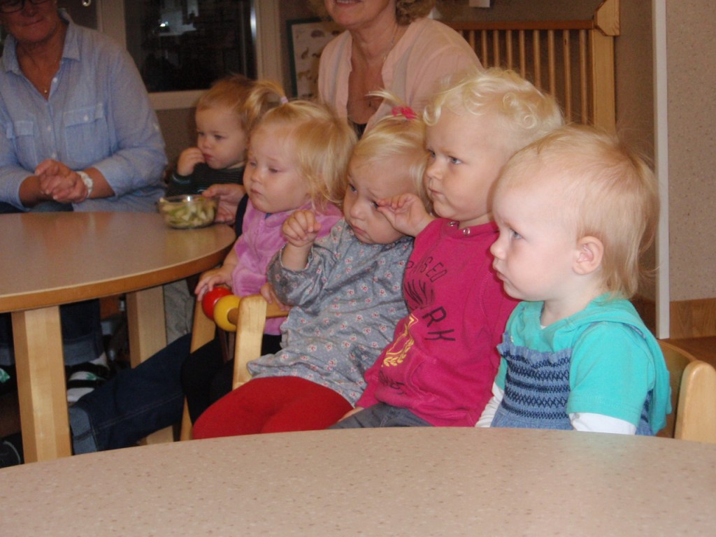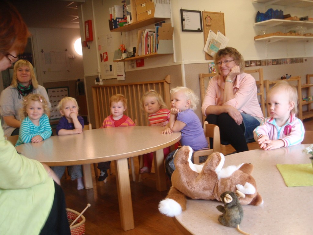 Jeg fikk lov å være med fortellerpedagog Mia Vickell og Camilla Ek ut til barnehager, der 5 åringene skulle få fortellinger. Fortellingene var tilrettelagt for barn, og det var gjort valg på at denne aldersgruppen skulle få fortelling med støtte av konkreter, i dette tilfelle dyrefortellinger, og tegnstøtte. Alle 5.åringene i Ljungby fikk de samme fortellingene, og det gir dem en felles basis for fortellinger.