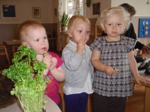 Pedagogene hadde med et lite bord, som de dekket med et klede og på det bordet utspant handlingen seg. I en av førskolene jobbet pedagogen ute, under en stor gran og i ly for regn. Det var vidundelig å lov til å være med to så dyktige fortellere ut på jobb. De uttrykte begge at de hadde verdens beste jobb, og det tror jeg dem på.